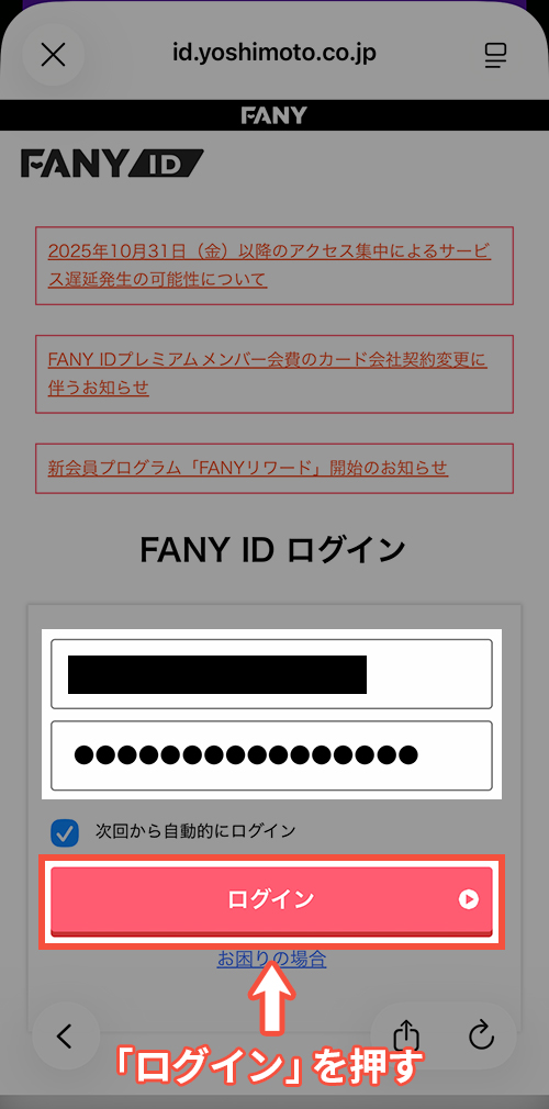 FANY ID(メールアドレス、パスワード)を入力し、「ログイン」ボタンを押します。
